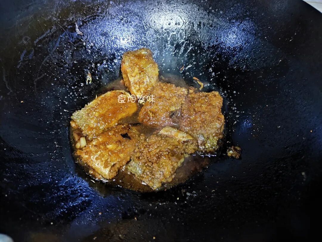 4.锅中的带鱼煎至两面微微焦黄,想知道带鱼是否煎好,可以晃动锅身。如果锅的鱼可以来回晃动,则说明带鱼的底部已经煎好。煎熬后用铲子将其再翻个面,再次用文火慢慢煎煮,直到锅中的带鱼,煎至两面焦黄后,往里面加入适量的酱油,醋,少量的水,然后盖上盖子焖煮,这样可以使其更加入味。