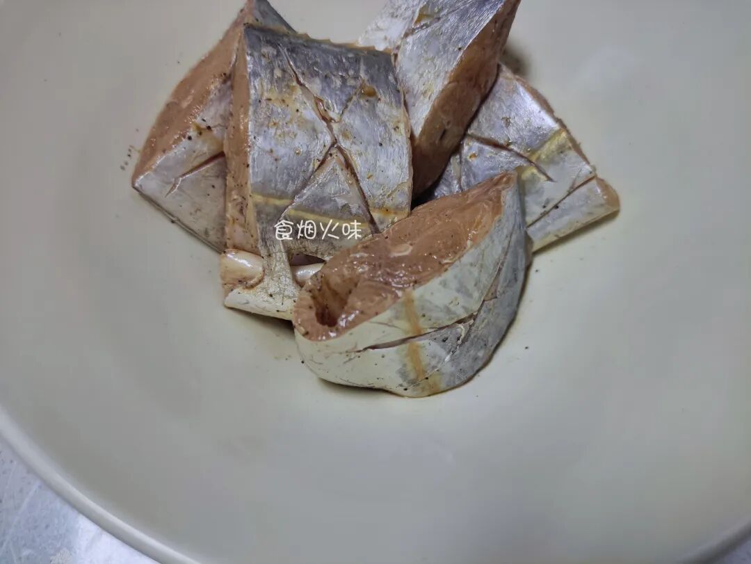 1.将买回来的带鱼处理里面的内脏,肚子的内膜也要处理干净,这个是决定煮出来带鱼鲜不鲜的问题。如果没有处理好的话,煮出来的带鱼会有腥味。处理干净后的带鱼要切成适合的长度。在带鱼身上对角线再切一刀。切好后的带鱼放到盆中,往里面加入适量的胡椒粉,酱油,醋,食盐,少量的食用油,然后用手将它们抓匀,放着腌制20分钟,使其入味;