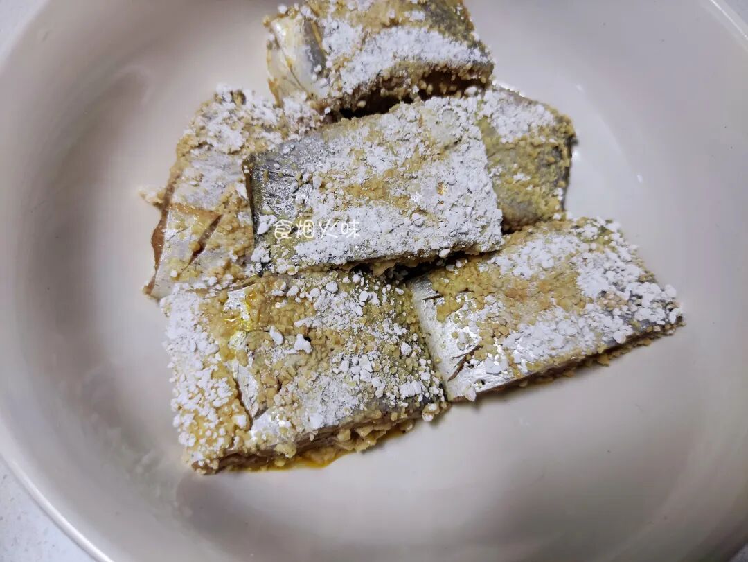 2.腌好后的带鱼放到一旁,准备一个鸡蛋,将鸡蛋打入碗中,搅拌均匀。旁边准备一个碟子,里面加入适量的淀粉。今天我选用的是地瓜粉,然后带鱼的身上裹上一层鸡蛋液,然后再将其放到地瓜粉上面裹一圈,裹好后的带鱼,放到盆中备用;