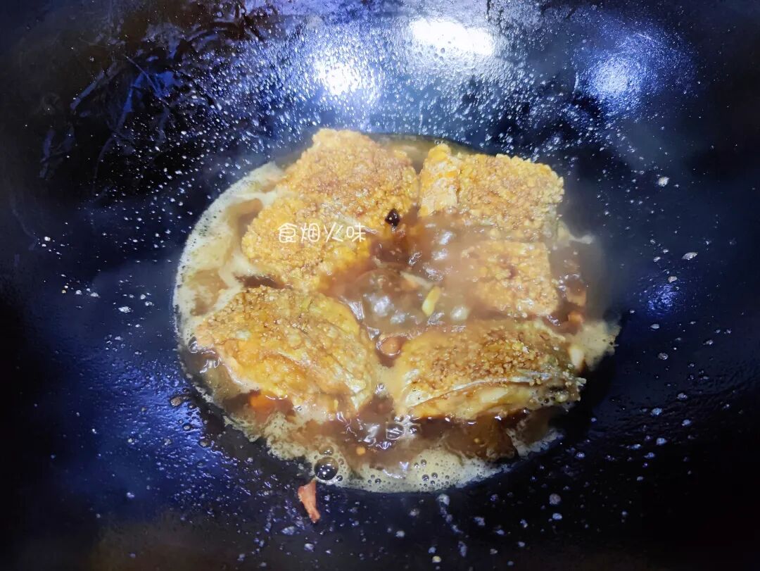 5.锅中的带鱼焖煮两分钟左右,然后打开锅盖。火稍微开大点,将里面的汤汁收干,然后即可出锅,出锅后放入盆中。在焖煮带鱼的时候可以将准备好的葱叶用牙签插成细丝,然后放在清水中洗一下,洗好后的葱花卷放到一旁备用;