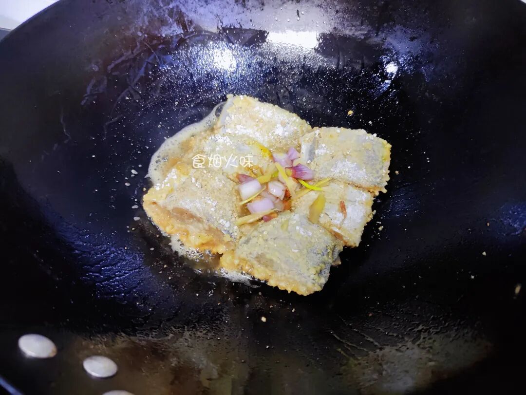 3.葱头跟生姜放在清水中洗净,洗净后的葱头放到案板上,切成细段。生姜也切成细丝状,切好后放到一旁备用。准备一个干净的锅,锅中的水分干后,倒入适量的油,热油润锅,将切好的葱头和生姜倒入里面,将其煸炒出香味。将腌好后的带鱼放入锅中,一个个地摆放好,带鱼下锅后不要翻动,用文火将其煎。