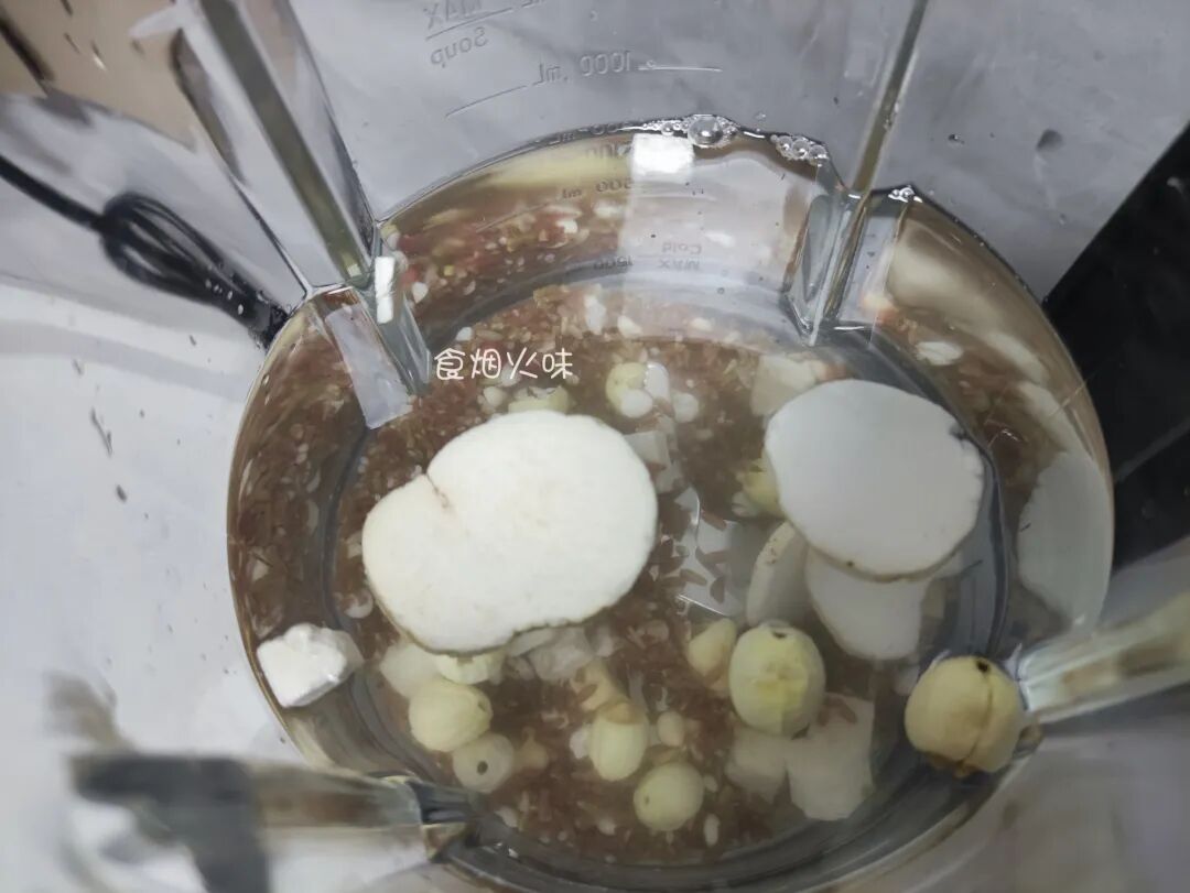 3.洗净后的食材倒入破壁机,冰糖也放入。往里面加入适量的水,然后将盖子盖好,按下开关,然后就可以自己做自己的事情。等煮好,再过来盛在碗中即可食用。
