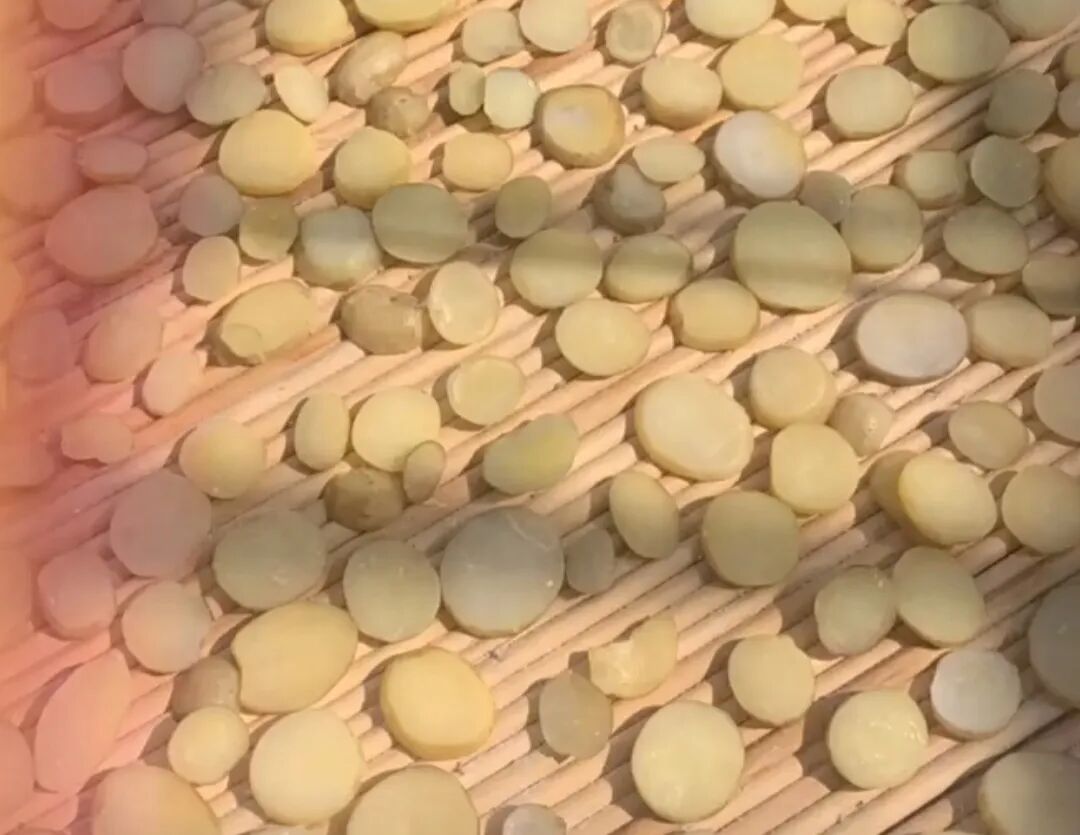 4.切好后的土豆片将其放在竹子簸箕上面,然后用手将土豆片摊开,拿到大太阳底下,晾晒2-3天左右即可。晾晒的过程中,有空可以过去将其翻个面,这样可以更好地晒干,而且不用担心底部热气潮湿会长霉。蒸熟后的土豆片放在底下晾晒,要尽可能地晒干,因为晒干后可以放的时间长,而且不会坏。