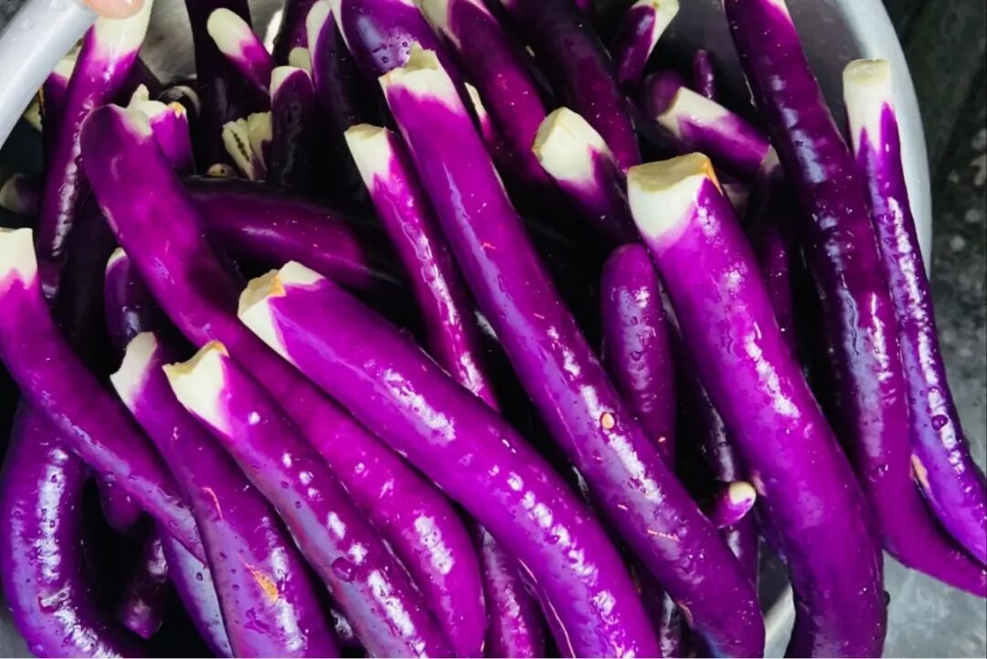 1.准备适量的茄子,茄子要选用这种长条的茄子。口感鲜嫩美味,做出来的菜口感好很多。现在正是季节,市场上卖的茄子也便宜很多,家里没有,可以市场上买一些回家做菜干。茄子的蒂用手将其去掉,然后放在水中,加入适量的水,食盐浸泡20分钟。经过浸泡可以去掉里面的脏东西,吃起来更放心,洗净后的捞出放在一旁沥干水分;
