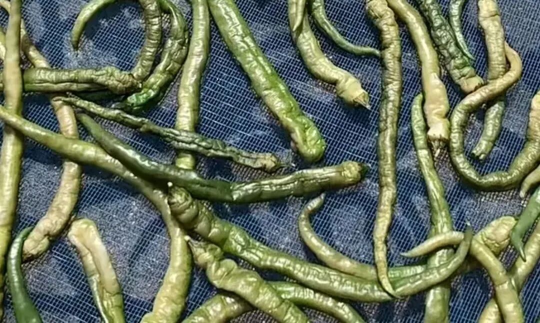 3.辣椒放入锅中焯水前后1分钟左右,焯水可以更好地起到杀菌消毒的好处,而且焯水后,捞出要晾干水分,会更加容易。辣椒捞出,将它放在比较通风的容器上面晾晒。可以是纱网直接铺上,辣椒放在上面后,用手将它们摊开,留有缝隙,这样晾晒更容易晒干;