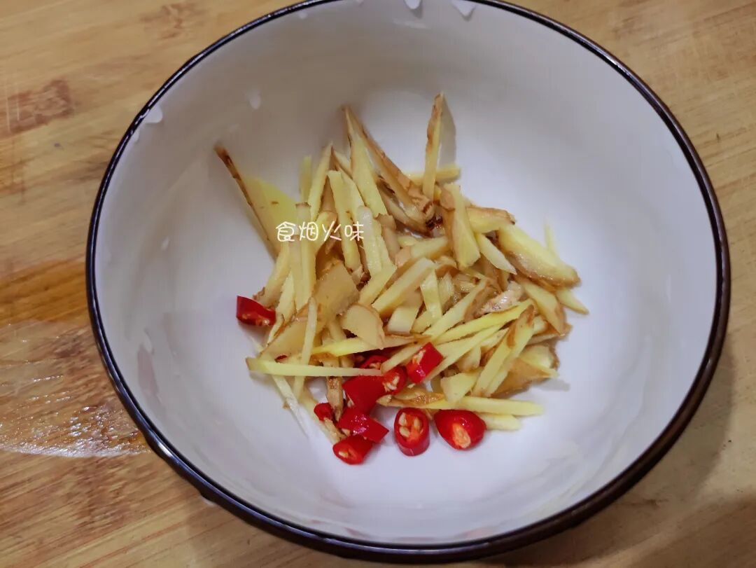4.准备一个干净的锅,锅中的水分干后,倒入适量的油,放入生姜丝,辣椒爆炒出香味。