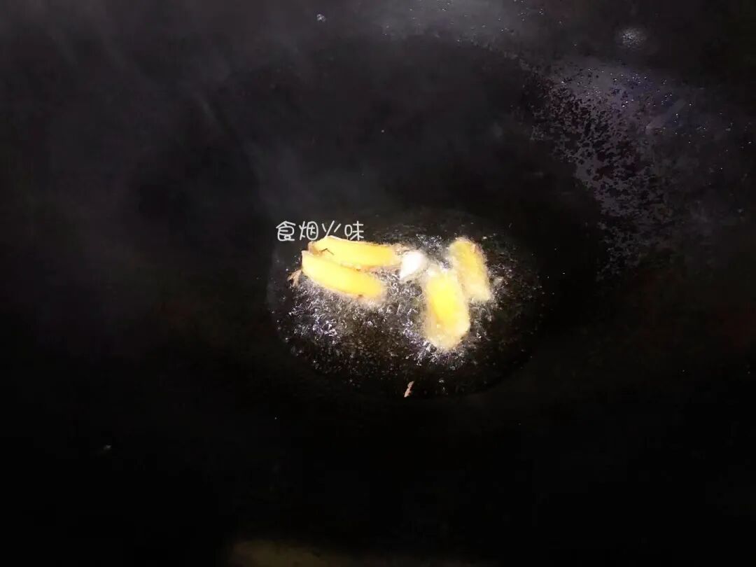 3.热锅中加入适量的油,将切好的生姜片放入油锅中煸炒出香味来。加入生姜增鲜提味。