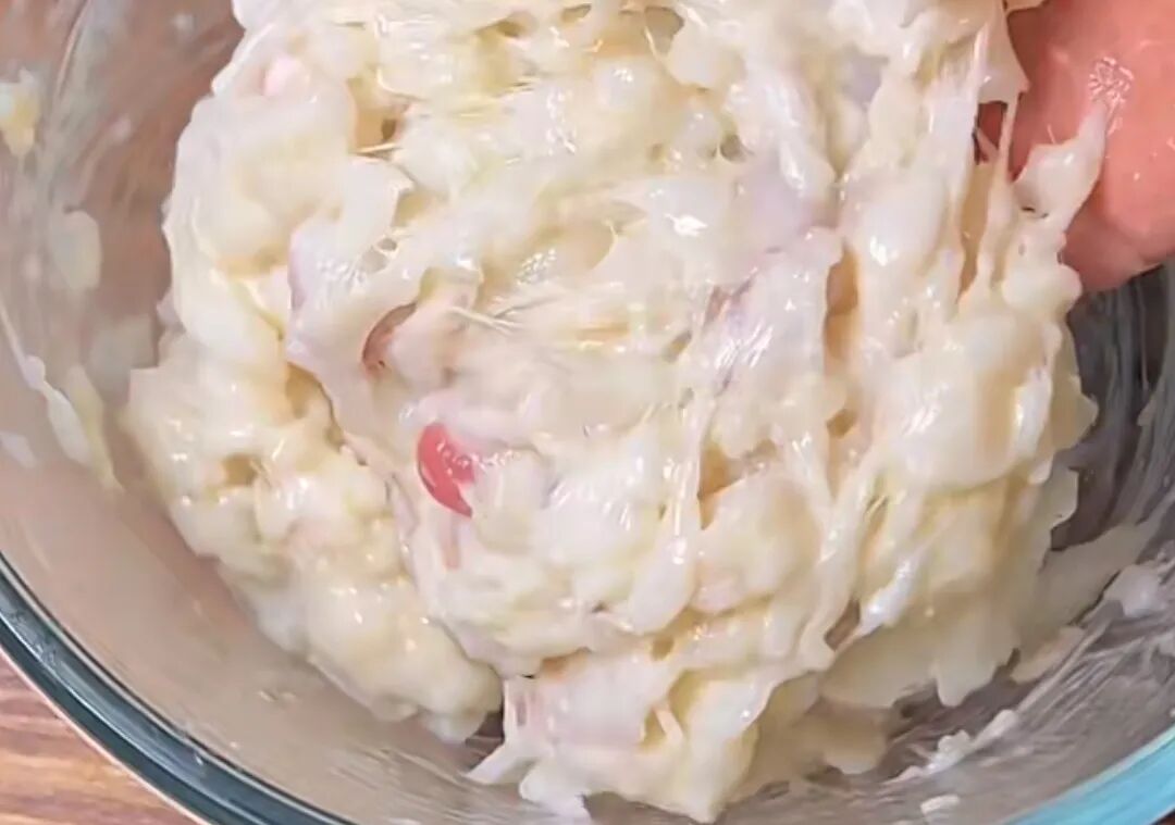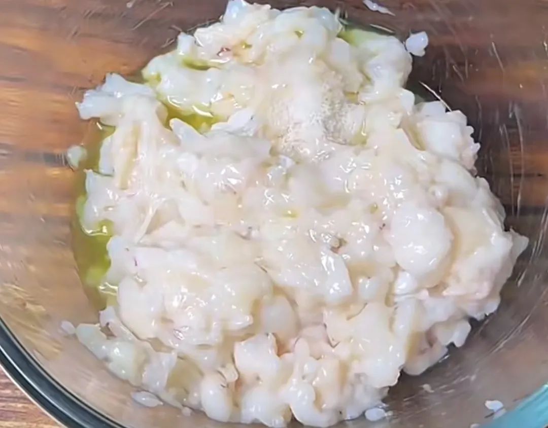 3.盆中加入适量的地瓜粉,食用油,食盐,鸡精,胡椒粉,用手大力将它们抓匀,慢慢抓,很快墨鱼肉就会粘成这样一团,放在一旁备用;