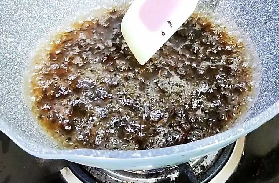 3.下锅后要勤翻动,以免煮焦了。将锅中的白糖茶叶炒至微微焦黄还有冒泡,全程用小火。