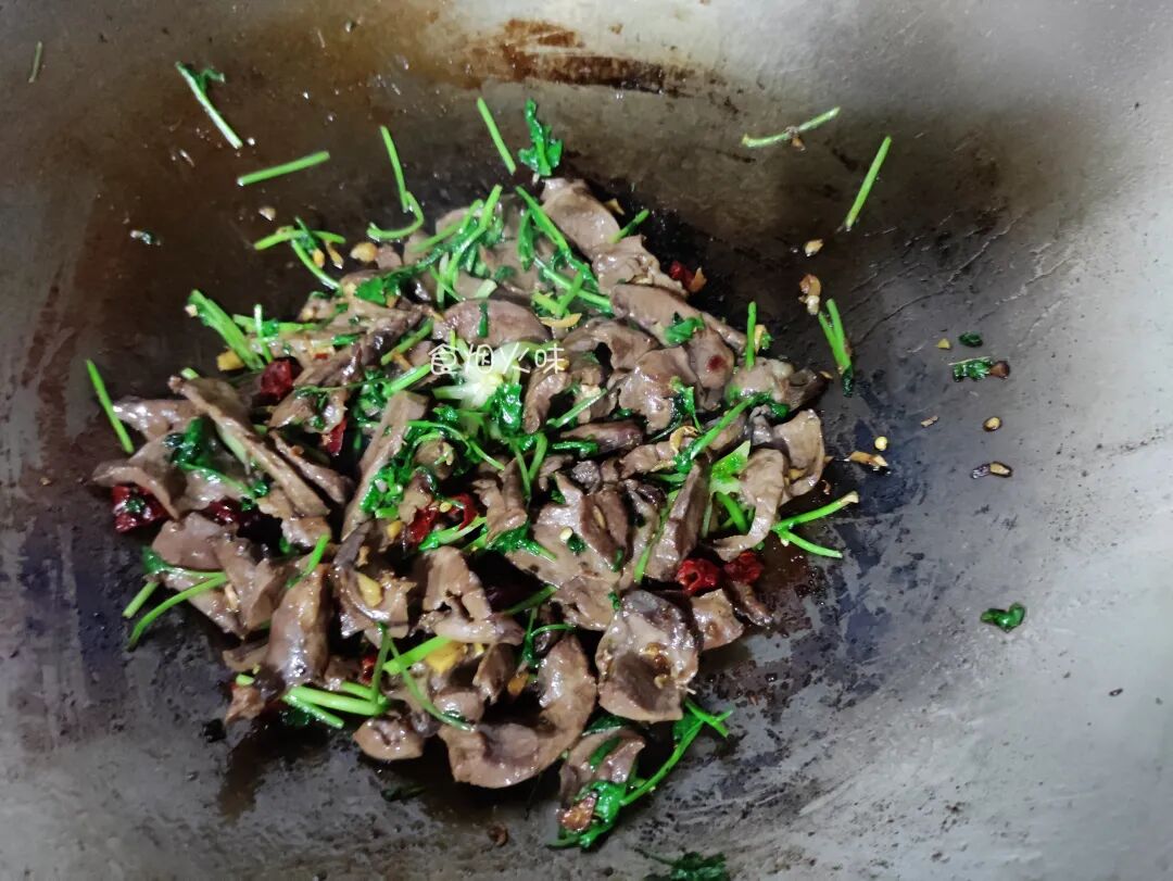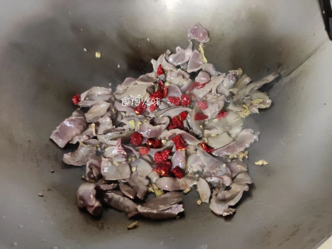 5.猪心下锅后炒至颜色发白后,加入切好的辣椒干。