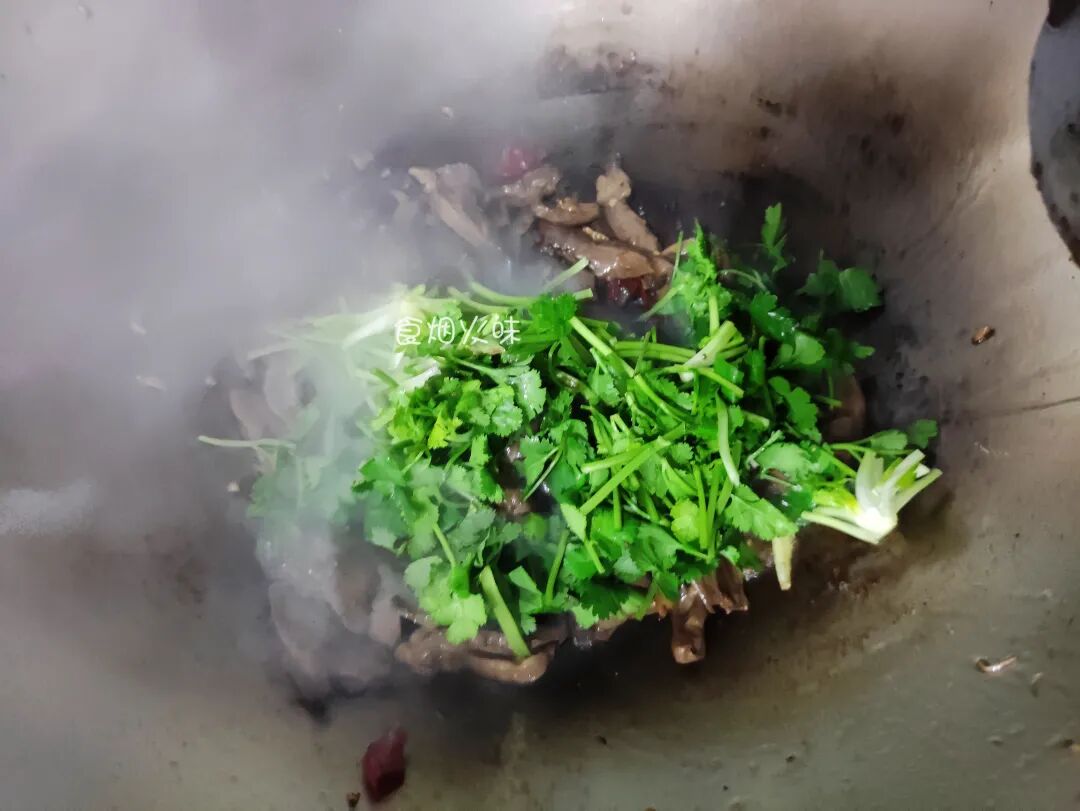 6.大火快炒,用铲子将它们炒至均匀。倒入切好的芫荽叶。