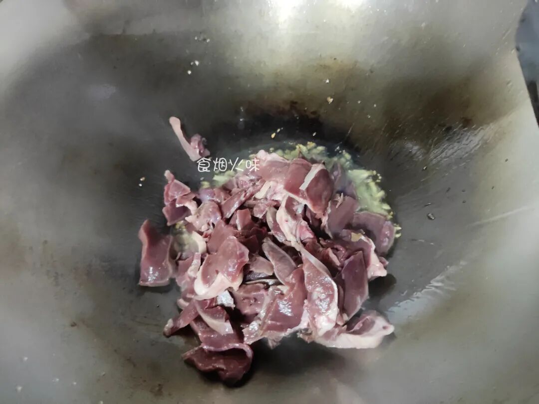 4.锅中的生姜末炒至焦黄焦黄的状态,将切好的猪心片倒入油锅中,这样时候要开大火,经过大火爆炒出来的猪心口感脆口,味道好,没有腥味。