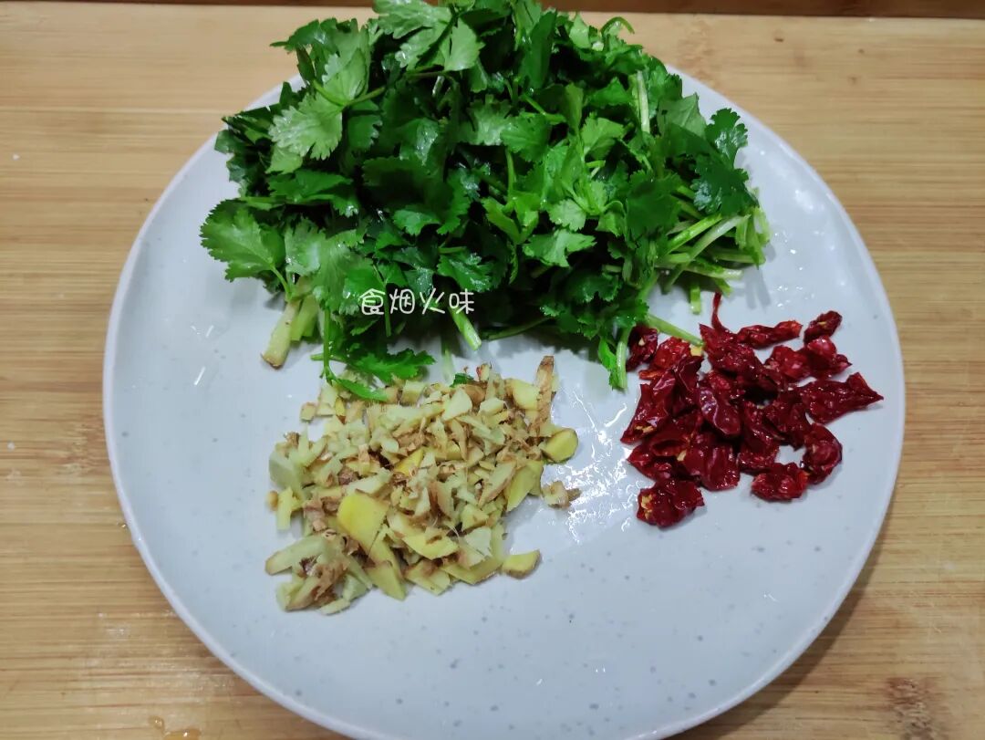 2.芫荽去掉根部以及黄叶烂叶,放入清水中浸泡会儿。生姜用水把表皮的泥土冲干净,记得细缝中,很容易藏泥土,要扯开再清洗;辣椒洗洗放着切断,生姜切成片再剁成末;芫荽泡好捞出洗净切段放在盆中。