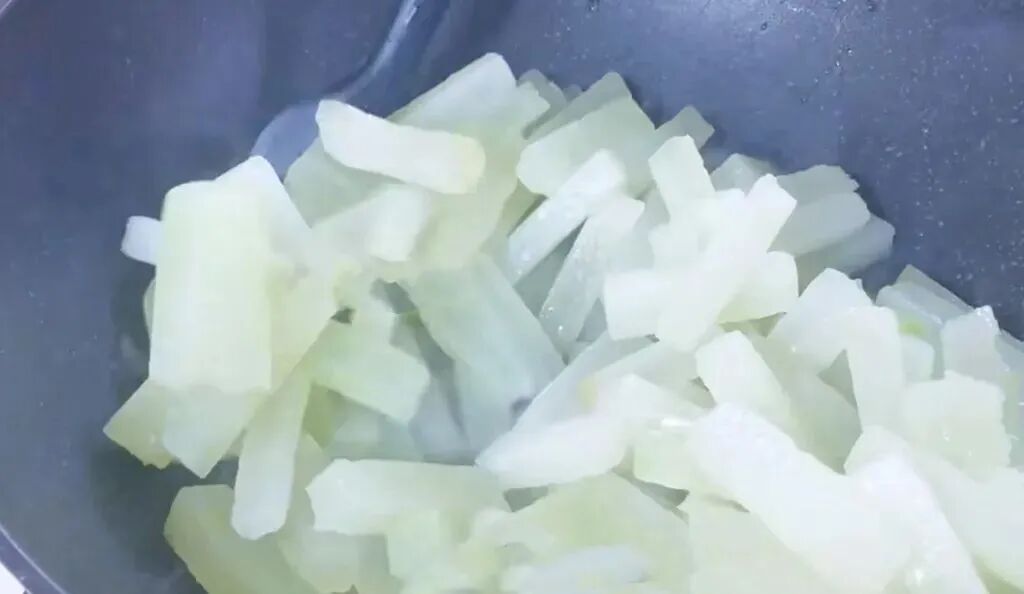 6.锅中的冬瓜炒至成下图这种状态后,就可以准备关火出锅。冬瓜下锅的时候,火可以大点,到后面,锅中的汁水没有了就要慢慢转为小火。