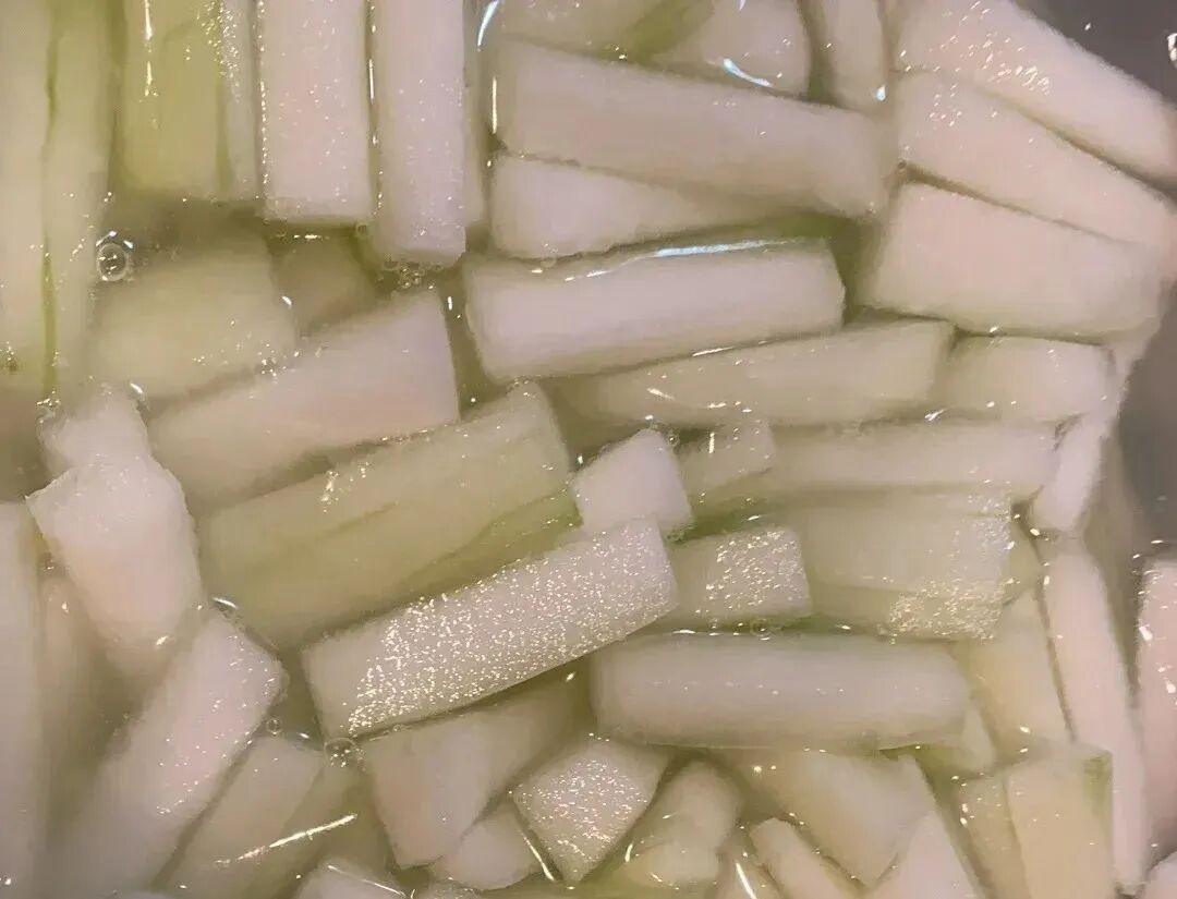 1.冬瓜洗净切成条,要切短,一厘米左右的厚度。切好放在石灰水浸泡一夜,浸泡后再用清水多次清洗,直至没有味道;