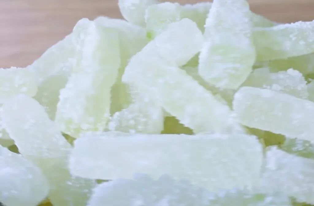 3.冬瓜条放在石灰水中浸泡一个晚上,倒掉水,然后取出一个,用手一掰,很脆很容易就掰断了。将它们放在清水中再次浸泡1小时,浸泡后用清水清洗4-5遍,将里面的石灰洗干净,直到闻不到很重的味道为止。