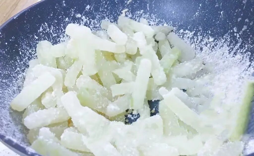 5.准备一个干净无水无油的平底锅,冬瓜经过腌,会有汁水,一同倒入锅中。开小火,铲子将它们翻动。一边炒一边翻动,炒的过程有点久,但是一定要小火慢慢炒。一段时间后,锅中的水分干,里面的糖浆都会裹在冬瓜的表面,慢慢变成一层白霜;