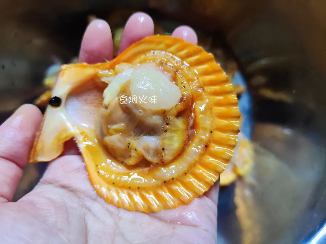 1.买回来的扇贝放在盆中,准备一把刀子,将扇贝撬开,只留一半壳,另外一半不要。用小刀将扇贝里面的内脏都清洗干净,打开里面有一块黑黑的东西,它是不能吃的,要用剪刀剪掉;