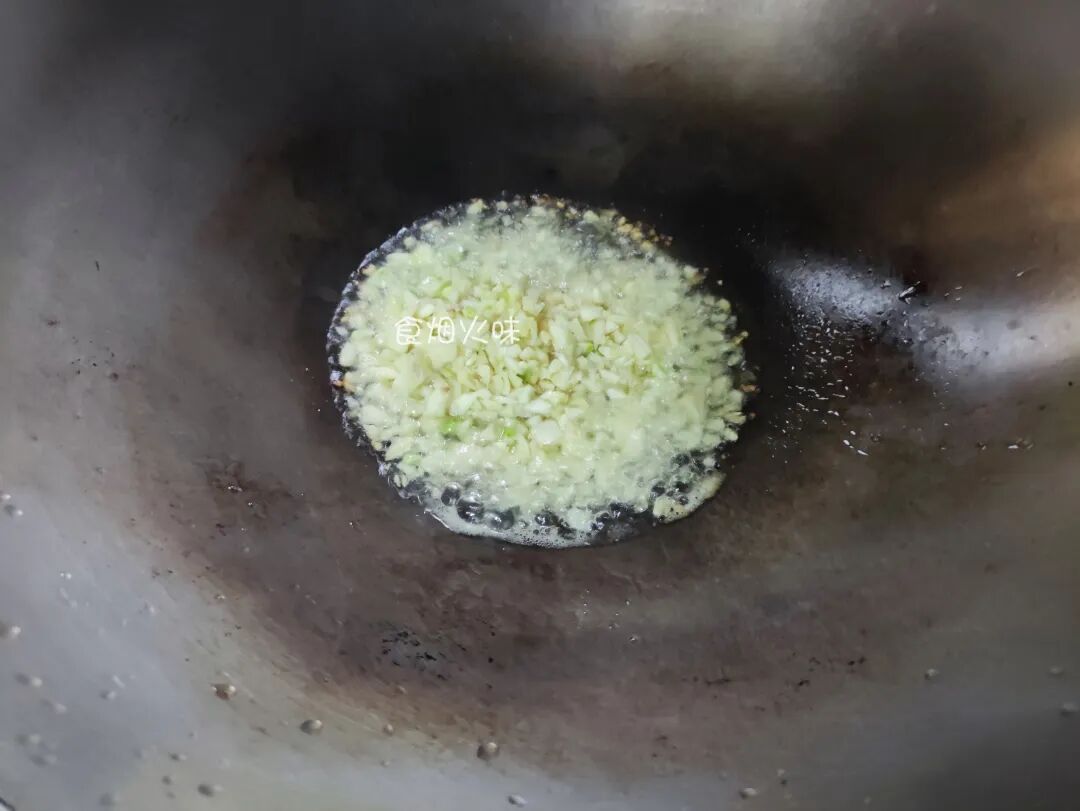 3.准备一个干净的锅,锅中的水分沥干后,倒入适量的油。锅中的油温热后,倒入切好的蒜泥,用小火将锅中的食材煸炒。蒜泥经过锅中煸炒,可以起到增香的作用;