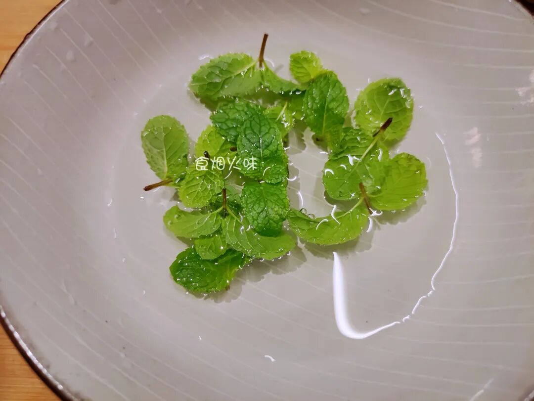 3.加入薄荷叶不仅提色增香。准备好的薄荷叶放在盆中,加入食盐水浸泡。随后捞出洗净放在一边备用;