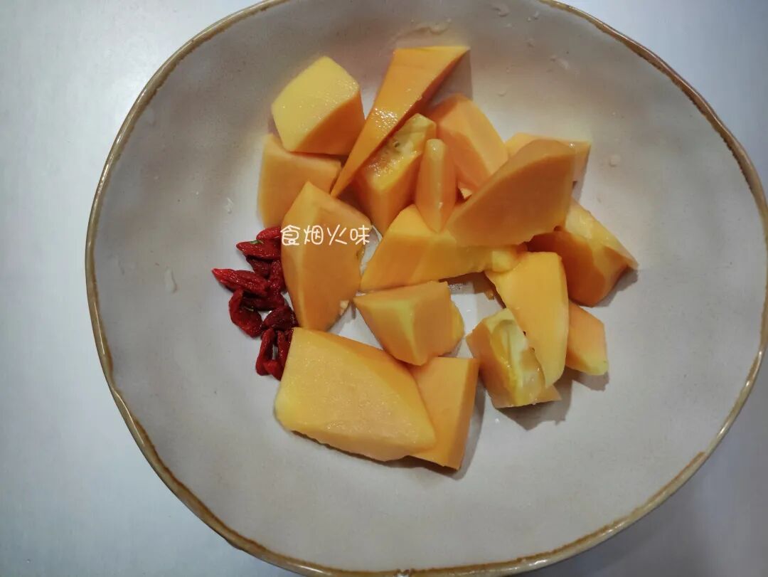 3.木瓜用削皮刀去掉表皮,木瓜的头部要切掉,那块硬硬的地方,吃起来有点苦涩,最好去掉。削皮后的木瓜对半切,掏出其木瓜籽,里面的白色筋要去除干净。随后放在案板上切成细块,枸杞也放水中洗净,处理好放盆中备用;