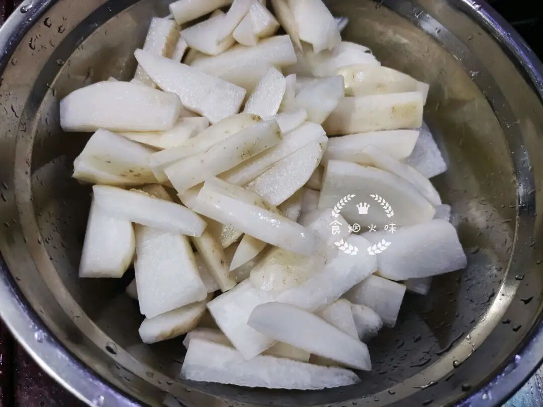 5.倒掉锅中的汁水后,再放入适量的凉白开水,抓洗一下,将白萝卜中的苦味洗出来,这个过程要重复两遍。