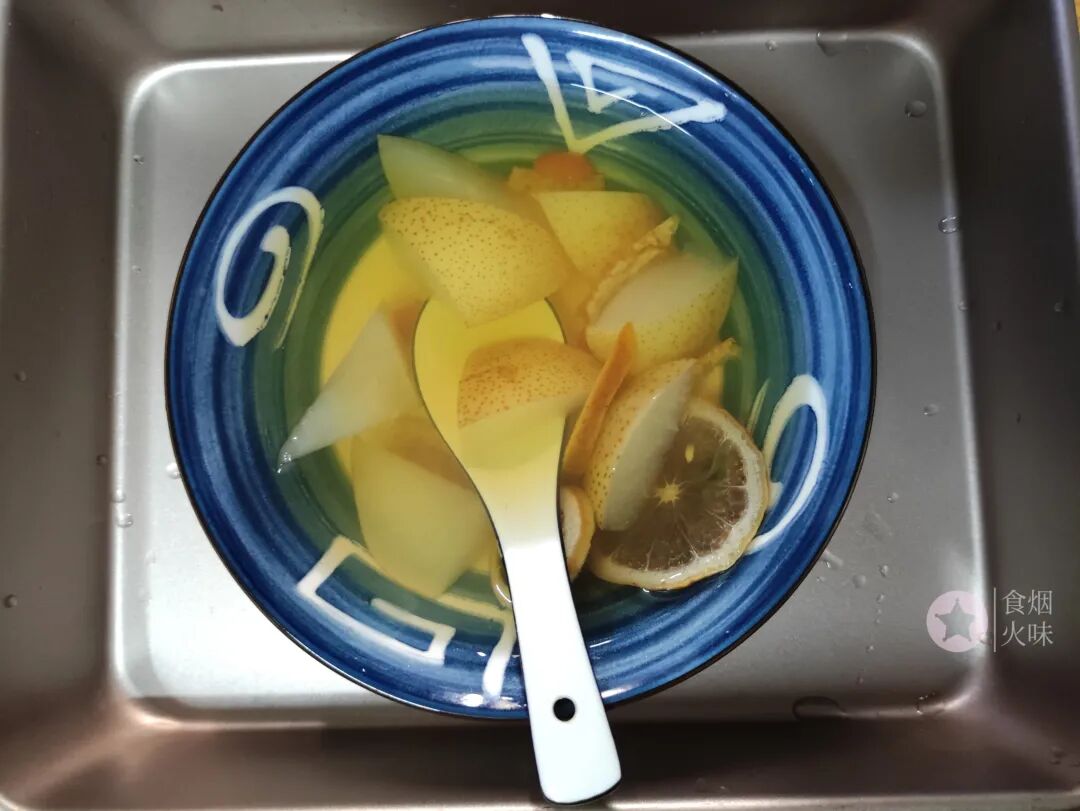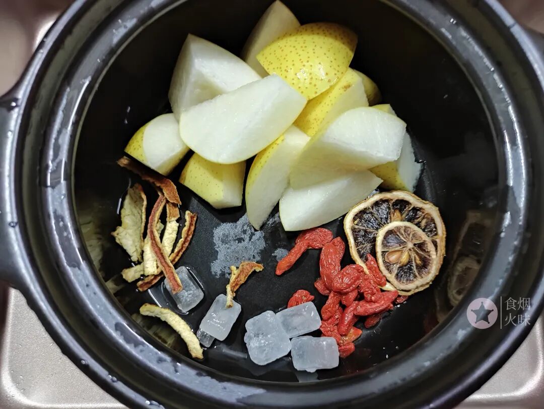 1.陈皮,枸杞,柠檬干放入水中,加入适量的面粉,用手抓洗几次。陈皮,枸杞,柠檬干在晾晒的时候会有灰尘依附在表面,所以可以用面粉吸附其表面的脏物,最后再用清水洗净放一旁备用。秋梨表面洗净,手心抓一把食盐,在梨的表面搓洗几次,洗净的梨用刀切成块,梨核就不要加下去了。