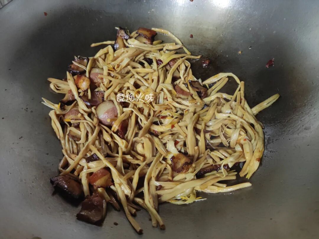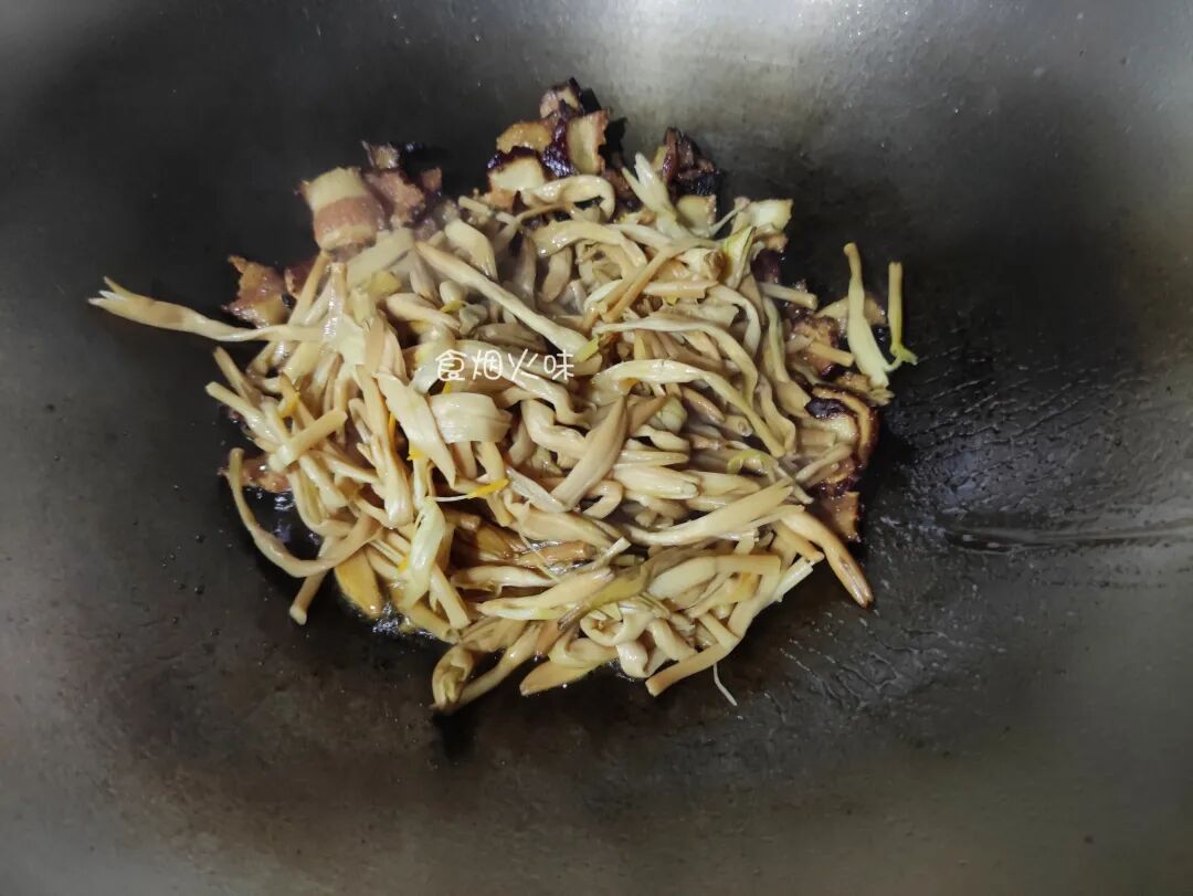 4.准备一个干净的锅,锅中水分干后的倒入适量油,倒入腊肉片,用小火将腊肉煸炒出里面多余的油脂。锅中的腊肉炒至微微卷起来,放入洗净后的黄花菜,用铲子将它们翻炒均匀;