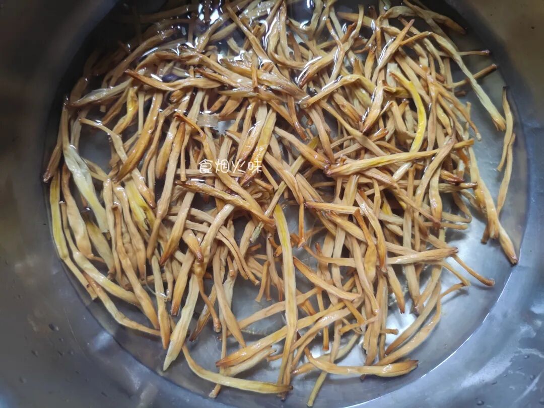 2.浸泡好的黄花菜捞出来,用清水冲洗干净,要多洗几遍,把里面的碱洗干净,煮出来的口感才会好。洗净后用手挤干水分,放在盘中备用。
