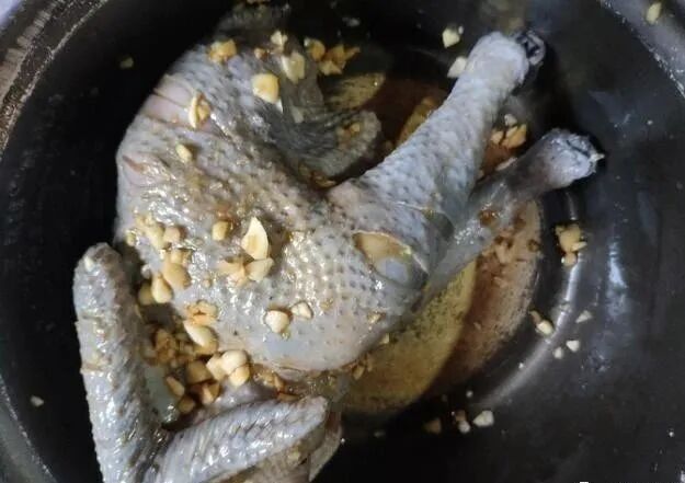 3.乌鸡的全身先用盐巴抹匀,静置5分钟,使之充分入味。涂上一层麻油,再涂抹酱油醋汁,将乌鸡的整个身体都抹上一层,随后将准备好的蒜沫涂满乌鸡的全身,在鸡的肚子放入3片姜片及蒜沫,就这样放着腌制20分钟左右。静置20分钟主要是为了能让它充分吸收入味;