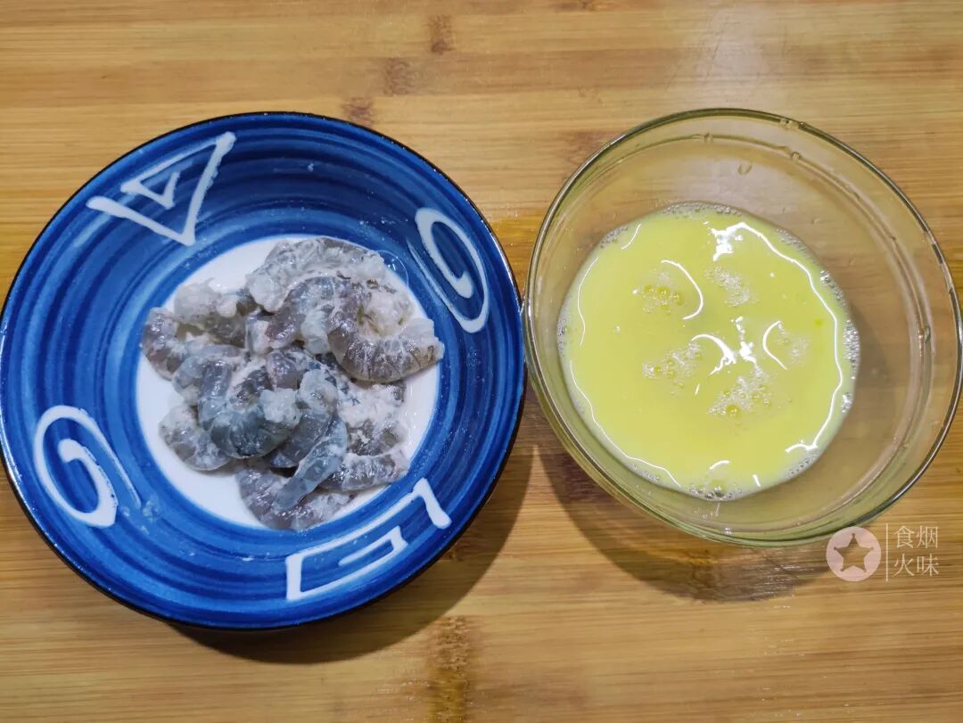 1.买回来的虾洗净,用手将虾头跟虾尾掰开。掰开的时候注意点,虾头连同虾线一起拔出来,再用手将虾线扯出,这样就不用再特地处理虾线,很是方便,用手将虾壳去掉。扯虾头的时候小心,虾头上有个尖尖的容易伤手。剥好的虾仁再用清水洗净,放在碗中;虾头也用清水洗净放在另外一个碗,虾头不要丢掉,放着有用,详见下期文章),加入适量的地瓜粉。鸡蛋打碎放碗中。