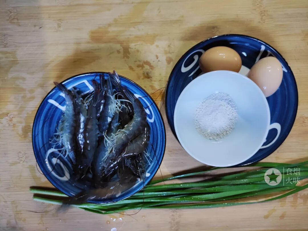 鸡蛋,虾,盐巴,地瓜粉,韭菜叶(也可以用葱花,主要用于点缀)
