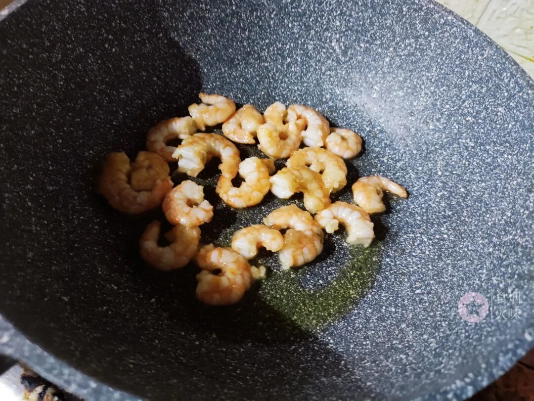 3.锅中加入适量的油,将虾仁放入锅中。锅中的虾仁炒至变红。