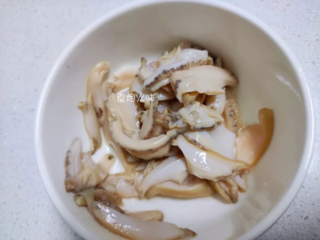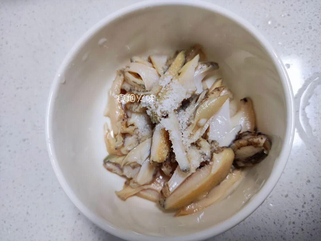然后将鲍鱼放在盆中,里面加入食盐,用手多次抓均匀。能更好地将其表面的清洗干净,洗净后放在案板上,用刀切成细片,切好放在一旁备用;
