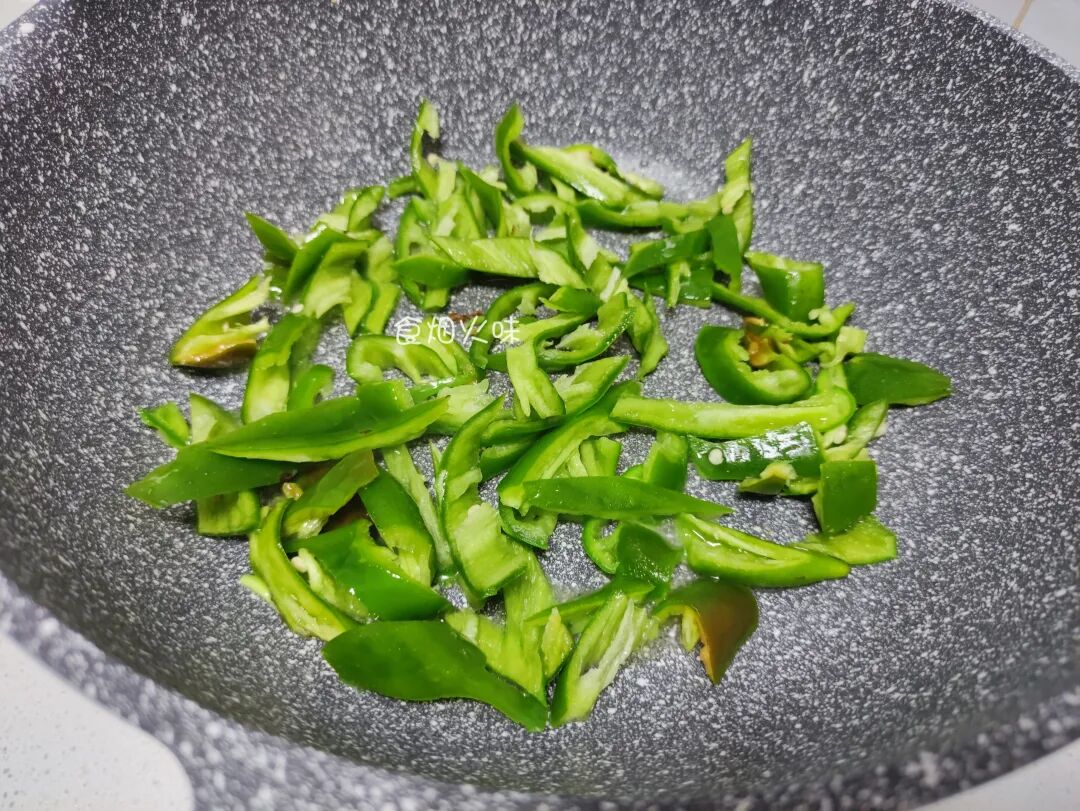 3.准备一个干净的锅,锅中水分干后,倒入适量的油。将青椒先倒入锅中煸炒,用铲子勤翻动。青椒放在锅中炒到表面有虎皮的状态,这种口感好,而且好入味;
