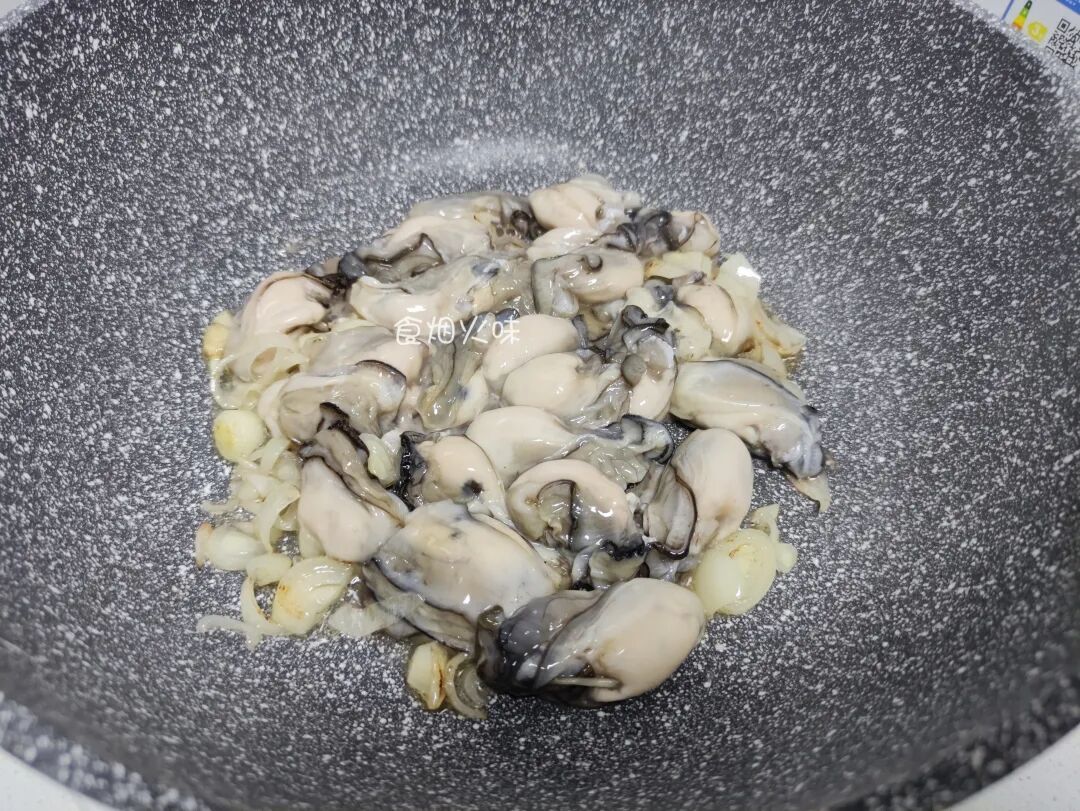 2.炒生蚝的时候,上面撒上适量的食盐调味,然后盖上盖子焖煮5分钟左右。鸡蛋比较容易熟,可以最后下锅;