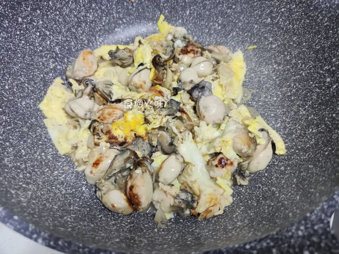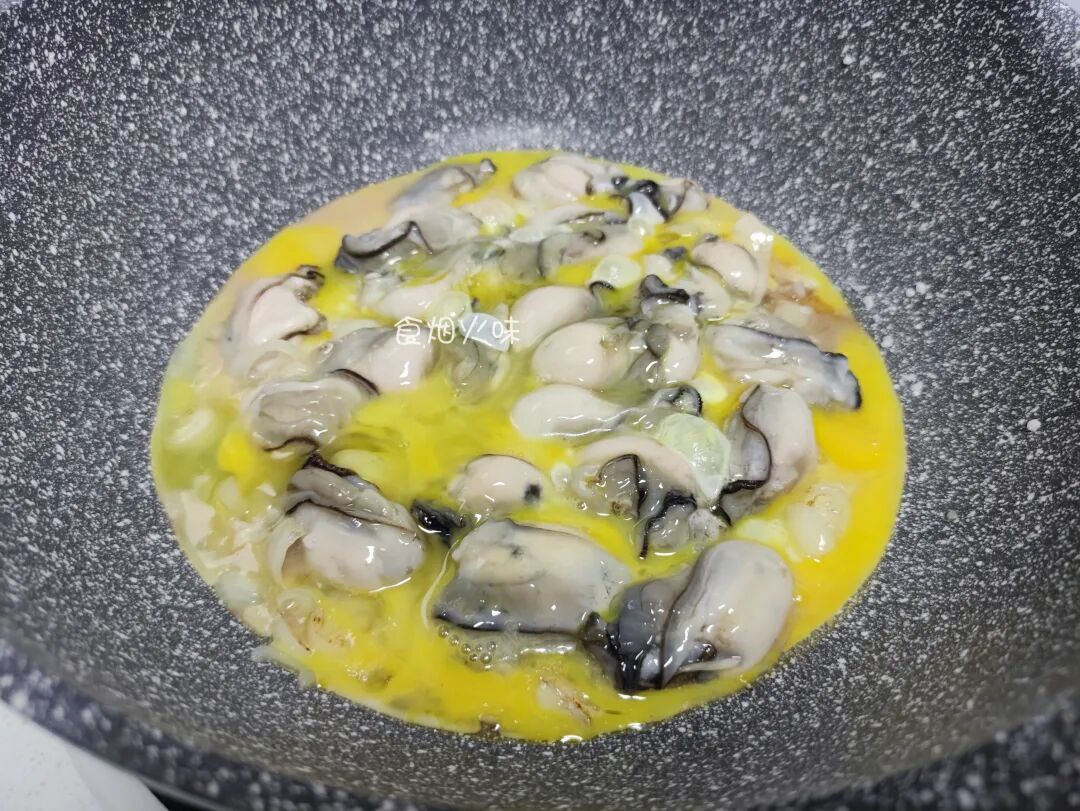 5.倒入鸡蛋液,随后盖上盖子焖煮5分钟。煮到锅中食材表面凝结成块,用铲子将它们翻个面,然后再继续煎煮,炒至两边的食材都成一整块。经过焖煮,生蚝也会变小。如果想吃嫩滑的,煮的时间就相对短,但是要确保有煮熟;没有煮熟的话,吃了可能会拉肚子。