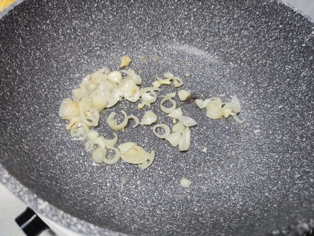 2.鸡蛋的表面洗净后打入碗中,倒入适量的水,用筷子将它们搅拌均匀。搅拌好的鸡蛋液放在一旁备用。准备好的葱头也切成细丁状。准备一个干净的锅,锅中的水分干后倒入适量的油,倒入葱头煸炒出香味;