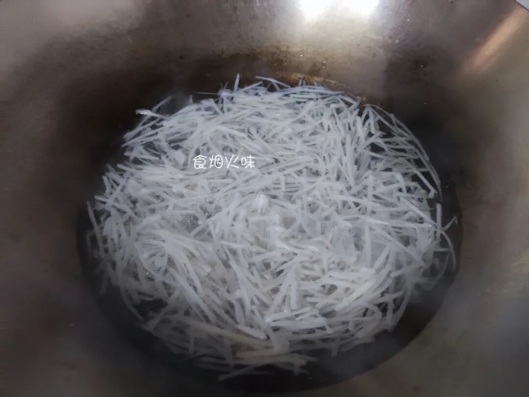 3.准备一个干净的锅,往里面加入适量的水,食用油,倒入洗净后的莲藕丝。莲藕在高中烧水1-2分钟,然后捞出来用冷水浸泡会儿,使其口感爽脆可口;