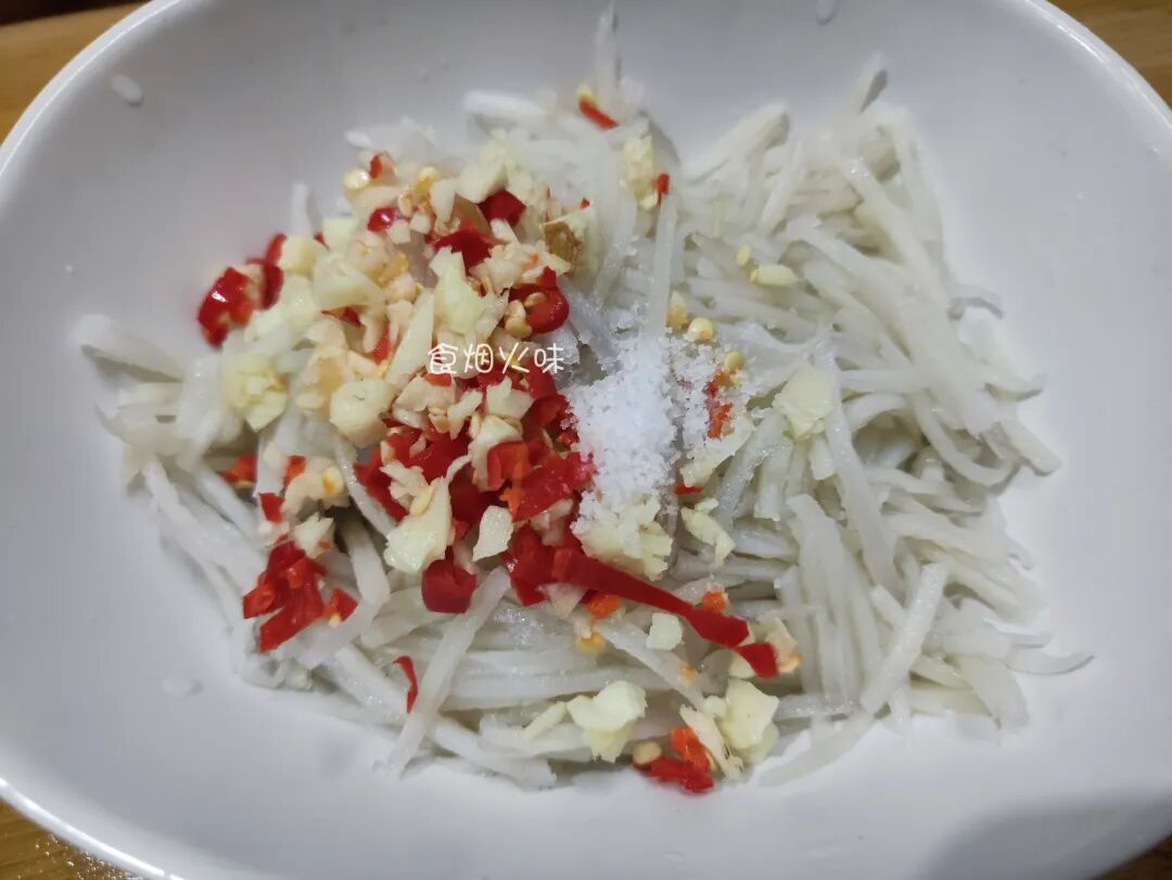 5.过凉水后的莲藕片放盆中,大蒜辣椒沫倒入盆中,加入食盐,白糖提鲜,少量香油增加香味;