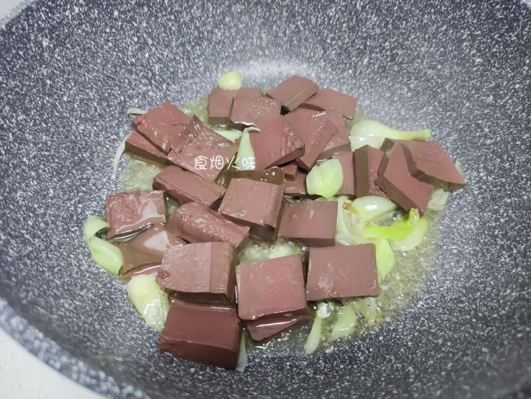 3.倒入切好的鸭血块,下锅后用铲子轻轻推开,这样可以更好地受热均匀,随后盖上盖子焖煮3分钟左右。焖煮的时候用小火,防止会炒焦了;