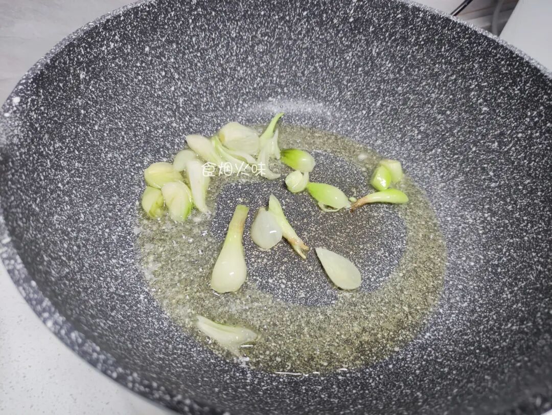2.准备一个干净的锅,锅中的水分干后,倒入适量的油。将切好的野葱头倒入锅中煸炒,炒的过程中散发出浓浓的香味。家里没有野葱头,可以直接用葱头或者是蒜瓣;