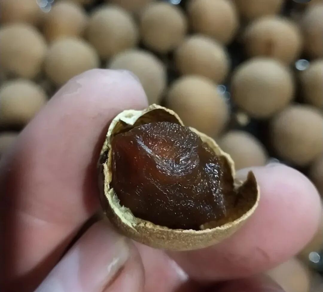 5.这些就是我烘焙加晾晒,有空就拿到柴火灶上面烘焙,然后烘焙两三小时,再放在太阳底下晾晒。来来回回,差不多一个礼拜,龙眼也就晾干了。可以拿起来一个,用手摇晃一下,有声音说明可以了。或者直接打开看,经过晾晒的龙眼,颜色是深色。吃起来,有嚼劲,而且很鲜甜。