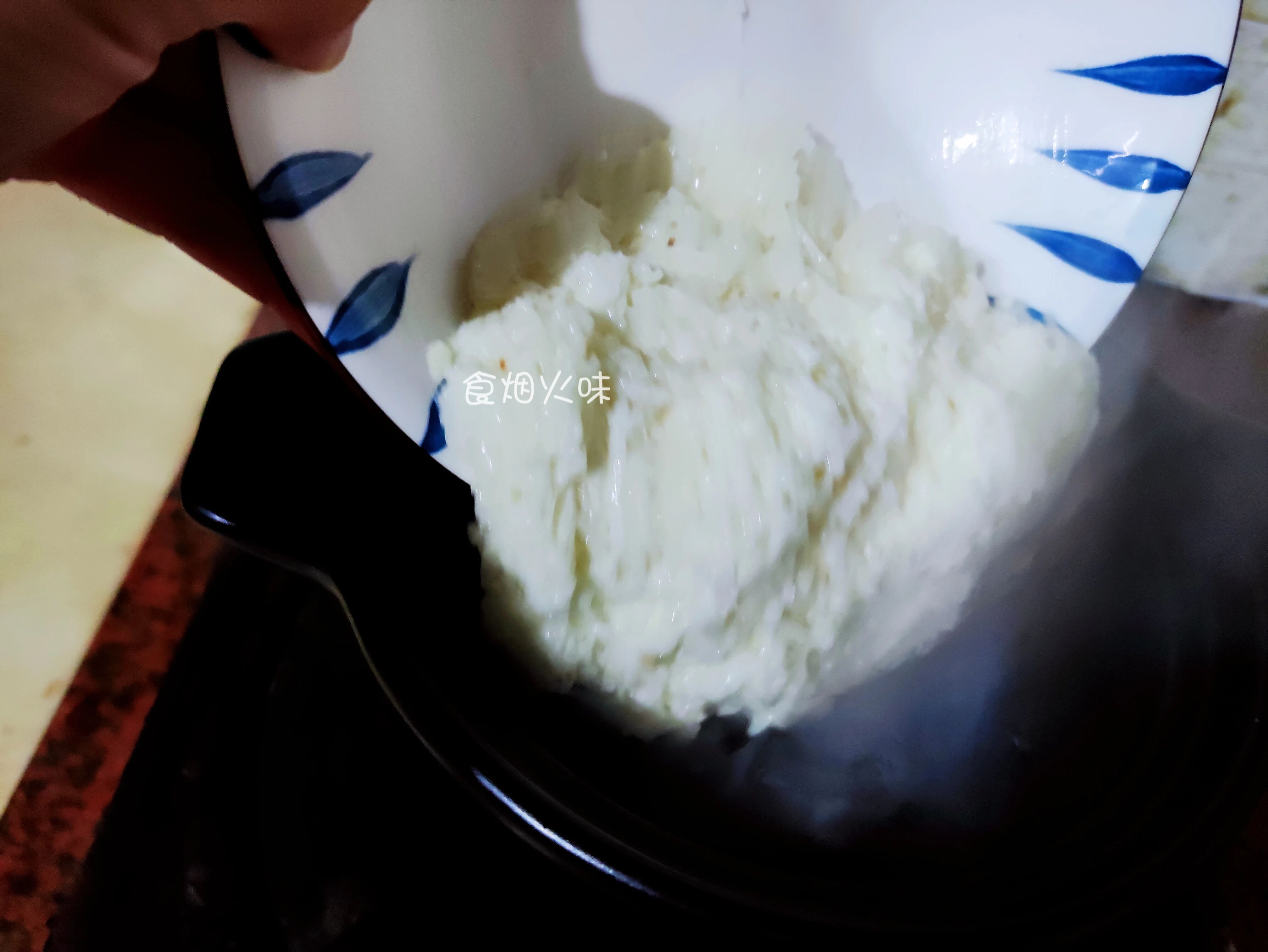 4.山药捣成泥煮很快就会熟,而且煮久容易粘稠,所以煮的过程中不要盖盖子,边煮边搅拌,防止粘锅。随后将蛋液也倒入,用勺子搅动;