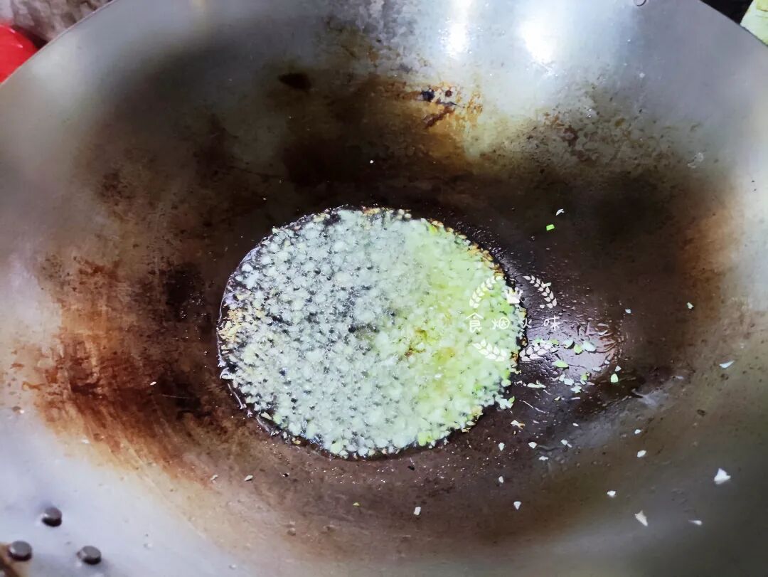 2.大蒜去皮,洗净放入案板,用刀拍碎,剁成沫。热锅下油,油温热将蒜沫放入锅中煸炒出香味来。蒜沫细倒入锅内,火要关小。