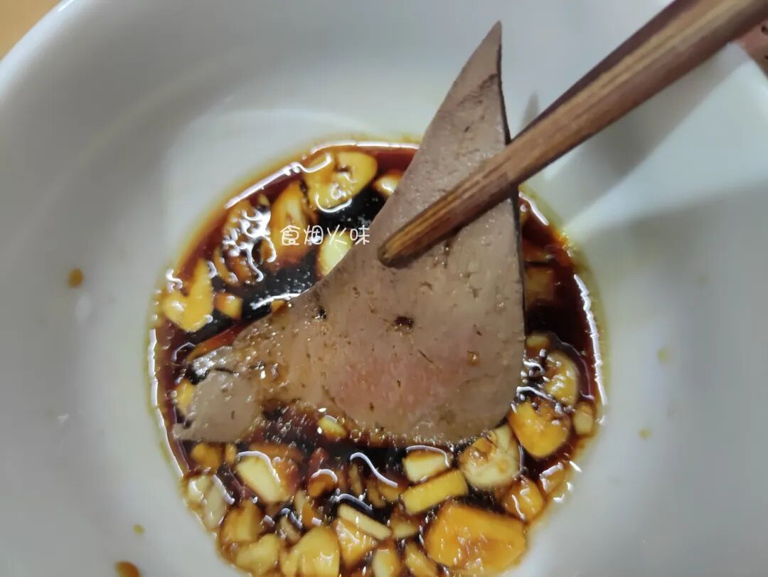 4.猪肝煮熟后,再放在焖会儿。浸泡在卤汁里面,可以让里面更加入味。准备好的大蒜去皮,然后剁成蒜泥,放在碗中,里面加入适量的酱油,醋,香油用筷子将它们搅拌均匀。想要吃时候,取出猪肝,将其切成细片,切的时候要尽可能地切薄,越薄口感越好。