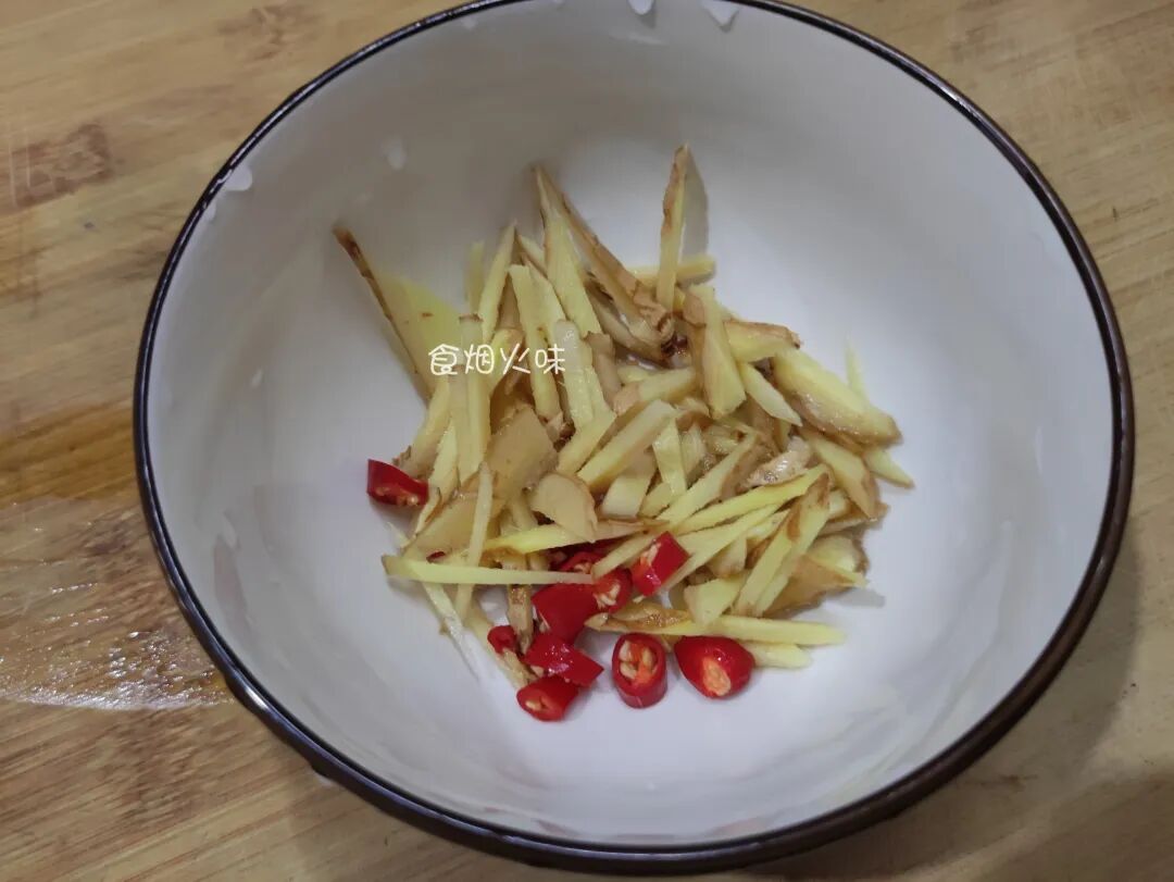 2.准备好的生姜,放在清水中冲洗干净。清洗的时候要记得生姜缝隙里面的泥土也要处理干净,然后放在案板上用刀切成细条,切好让在盘中备用。准备好的辣椒也要洗净切成段;