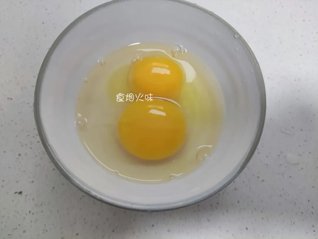 1.准备好两个鸡蛋,鸡蛋表面容易藏有细菌。特别是自家养的,捡回来为了能保存久一点,经常都会有分泌物,而市场上买的很多都是擦洗过的,看起来干净很多。鸡蛋表面用抹布擦干净,然后打入碗中;