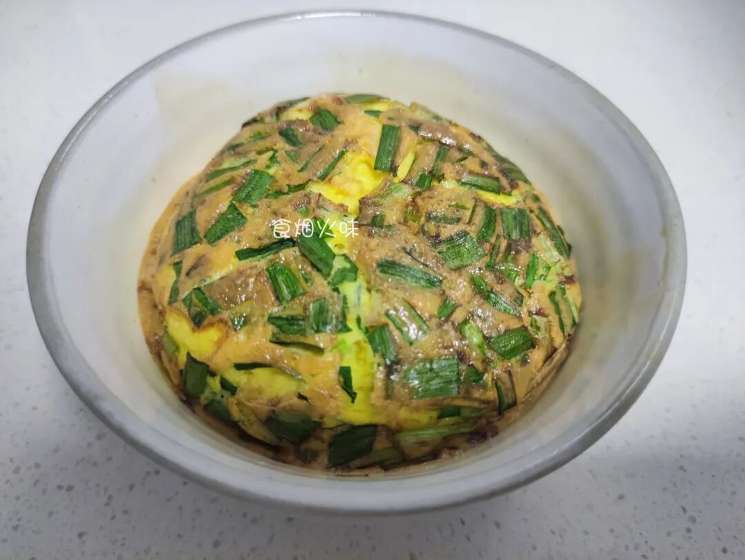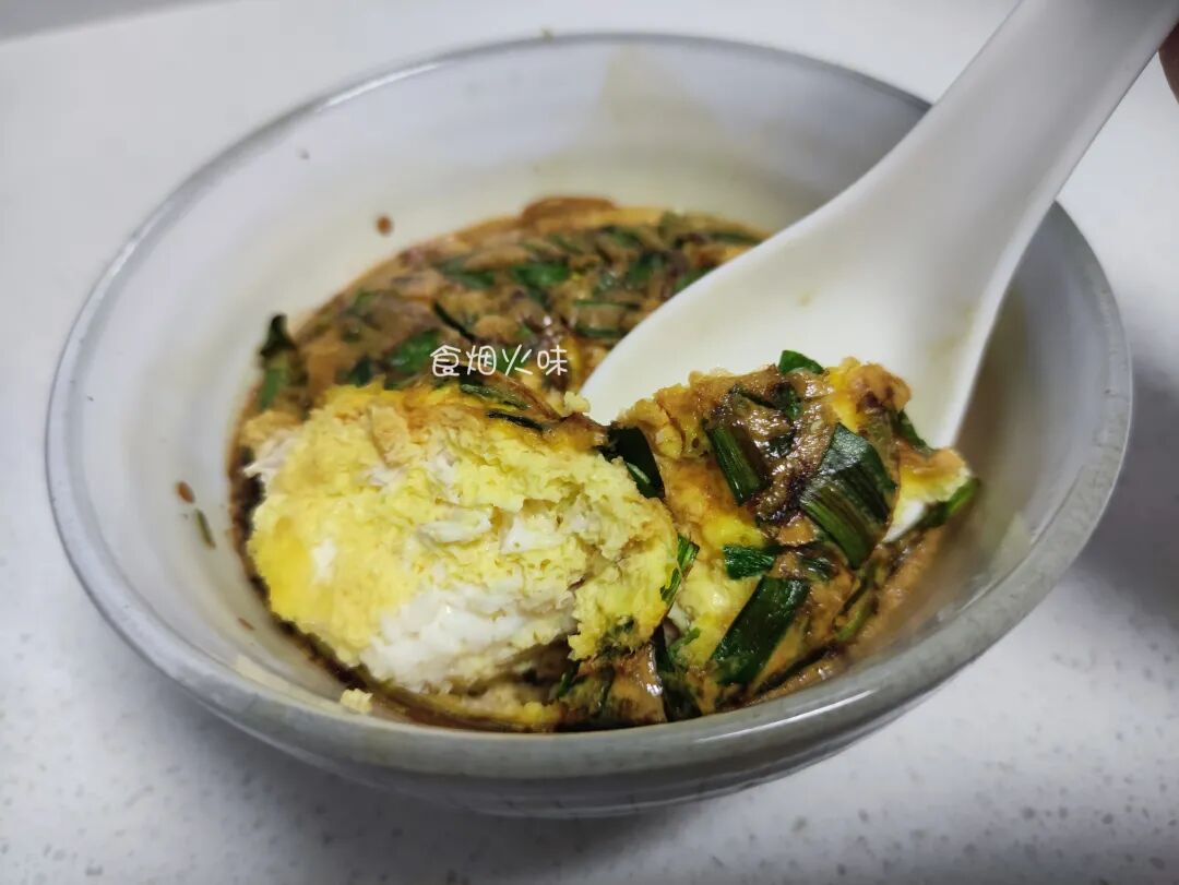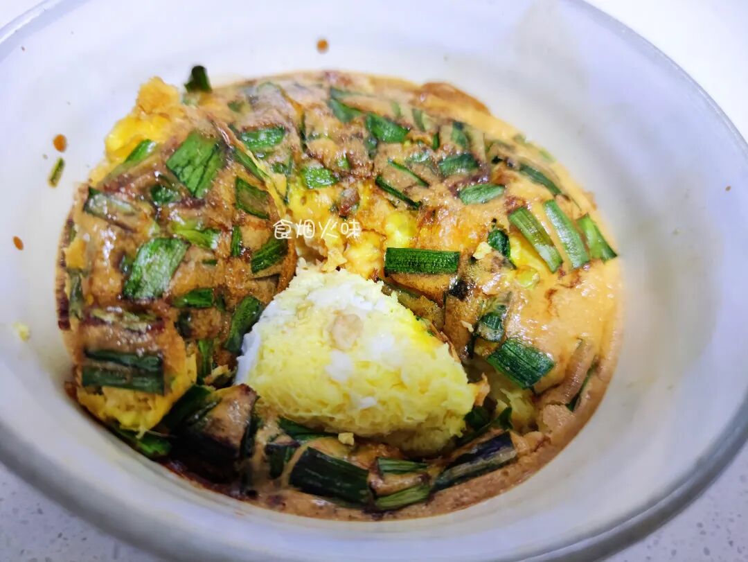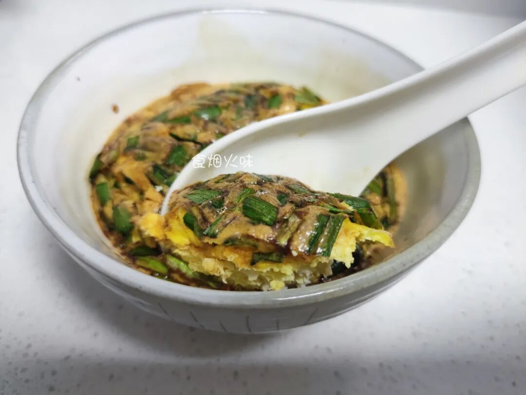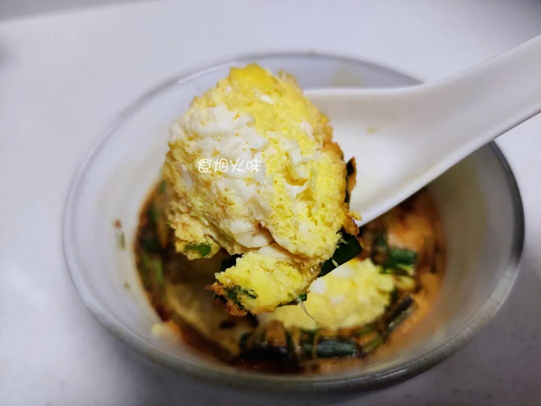 这样做出来的鸡蛋会有点膨胀,是因为热胀冷缩的原理,等稍微凉了就会慢慢缩回。最后点两三滴的酱油即可食用。鲜美好吃的“韭菜炸蛋”就完成,有韭菜的香味,还有蛋的鲜味。不仅口感好,而且营养加倍,关键是这样做,很是方便。早上着急去上班,就可以这样做。