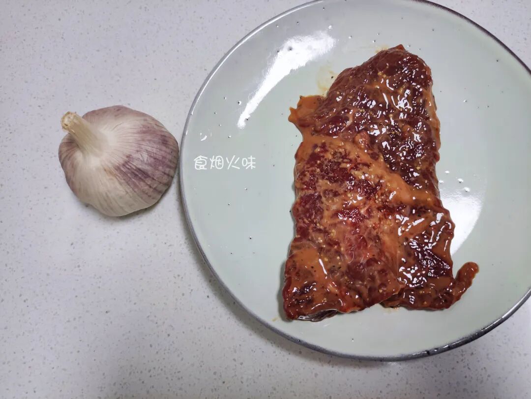牛排,蒜瓣,酱油,蚝油,胡椒粉,食用油(已经腌好的牛肉,调味品就相对没有那么多)